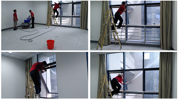 清潔員工先把安全繩系好,然后把留在玻 璃的保護膜全部撕掉,然后用全能清潔劑對玻璃涂擦后再用玻璃刀把污水刮干凈,有膠的地方用丁酮局部處理。